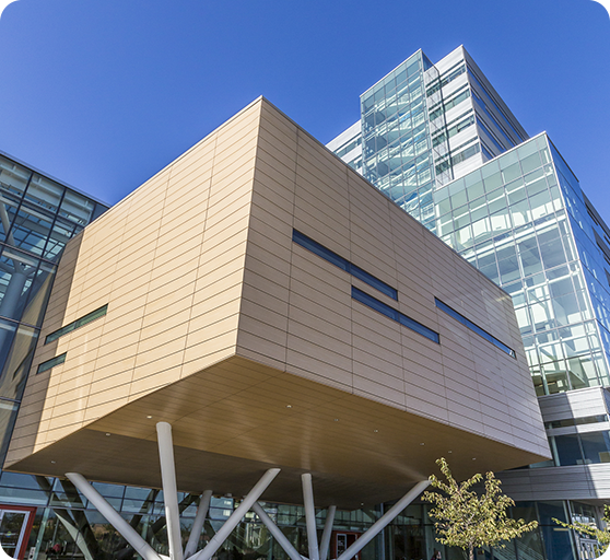 Fairview Architectural provided both Vitrabond® cladding panels and Edgeline® flashing material in the identical custom maple woodgrain pattern finish—ensuring perfect color matching and fade resistance across every façade component.