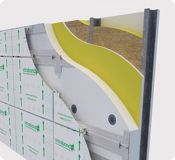 RapidWrapCI® is Fairview Architectural’s complete continuous insulation system engineered to wrap your building in superior thermal performance—reducing energy costs while meeting the industry’s most demanding fire and building code requirements. Designed as a seamless integration of the Arrowhead® installation systems and your choice of Vitrabond FR® or Vitraplate® cladding, RapidWrapCI® delivers a fully-tested, single-source solution that simplifies specification, accelerates installation, and ensures lasting performance.
